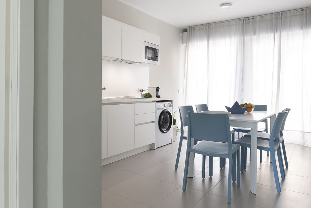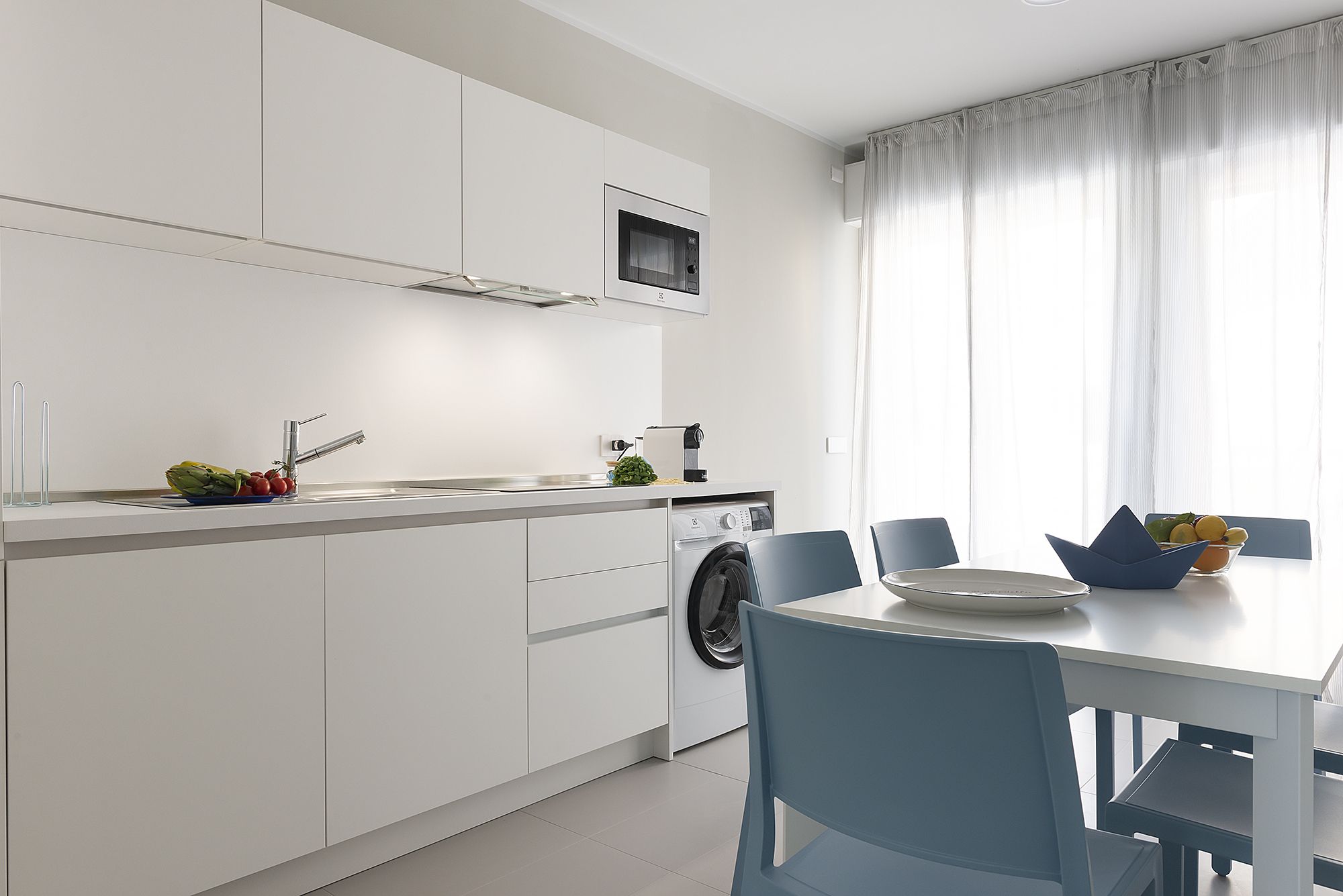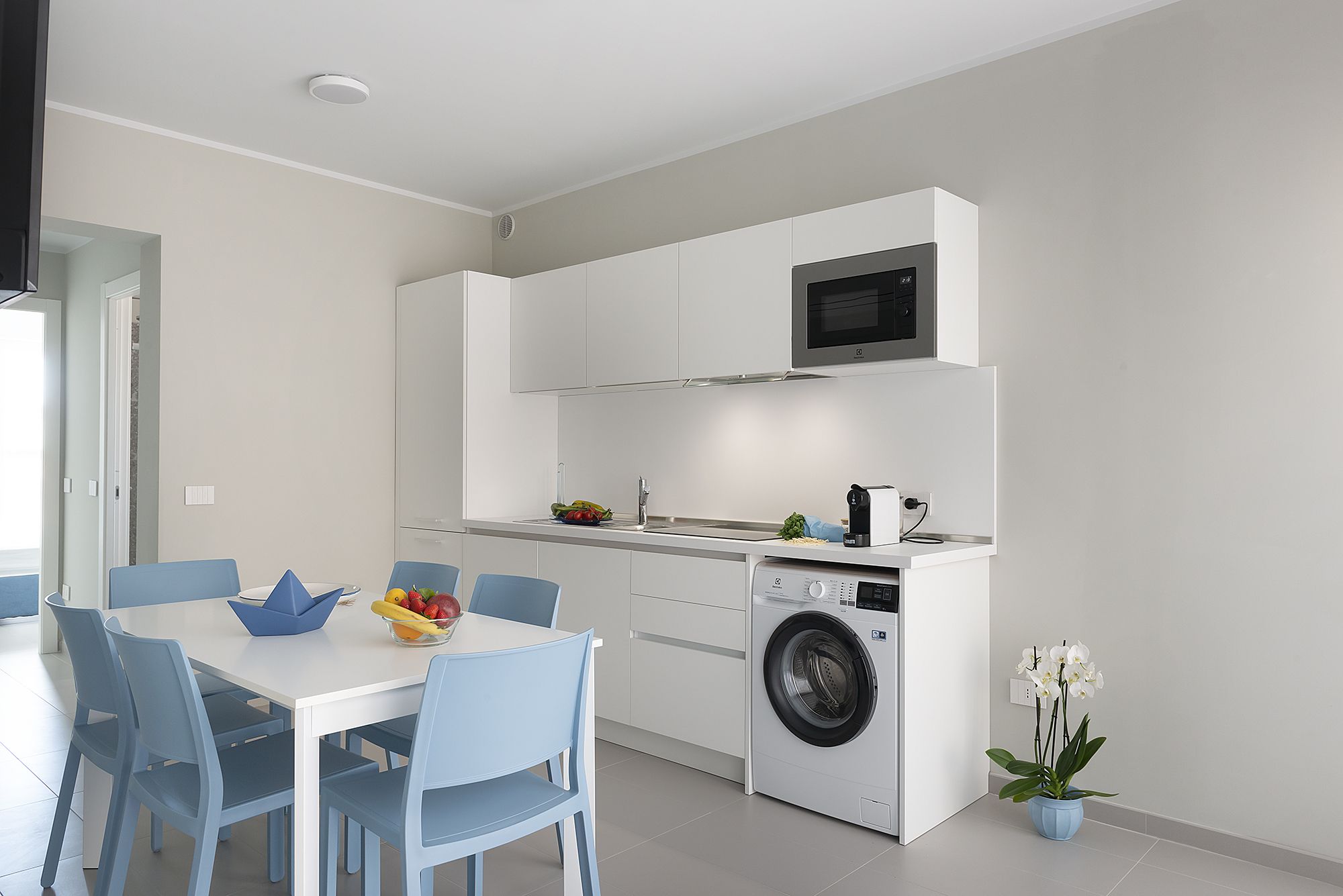 Trilocale di 65 metri quadrati per 6 persone, situato al primo piano con ascensore, composto da ingresso, ampio soggiorno con divano letto dormeuse, tavolo da pranzo e cucina con stoviglie, piano a induzione, frigorifero combinato, forno a microonde, lavastoviglie, lavatrice, bollitore elettrico, macchina del caffè Bialetti con cialde di benvenuto.