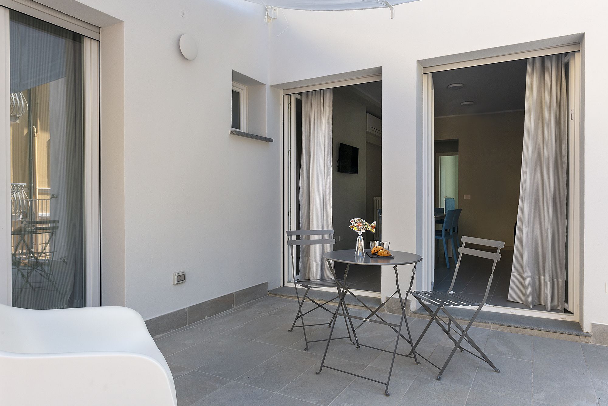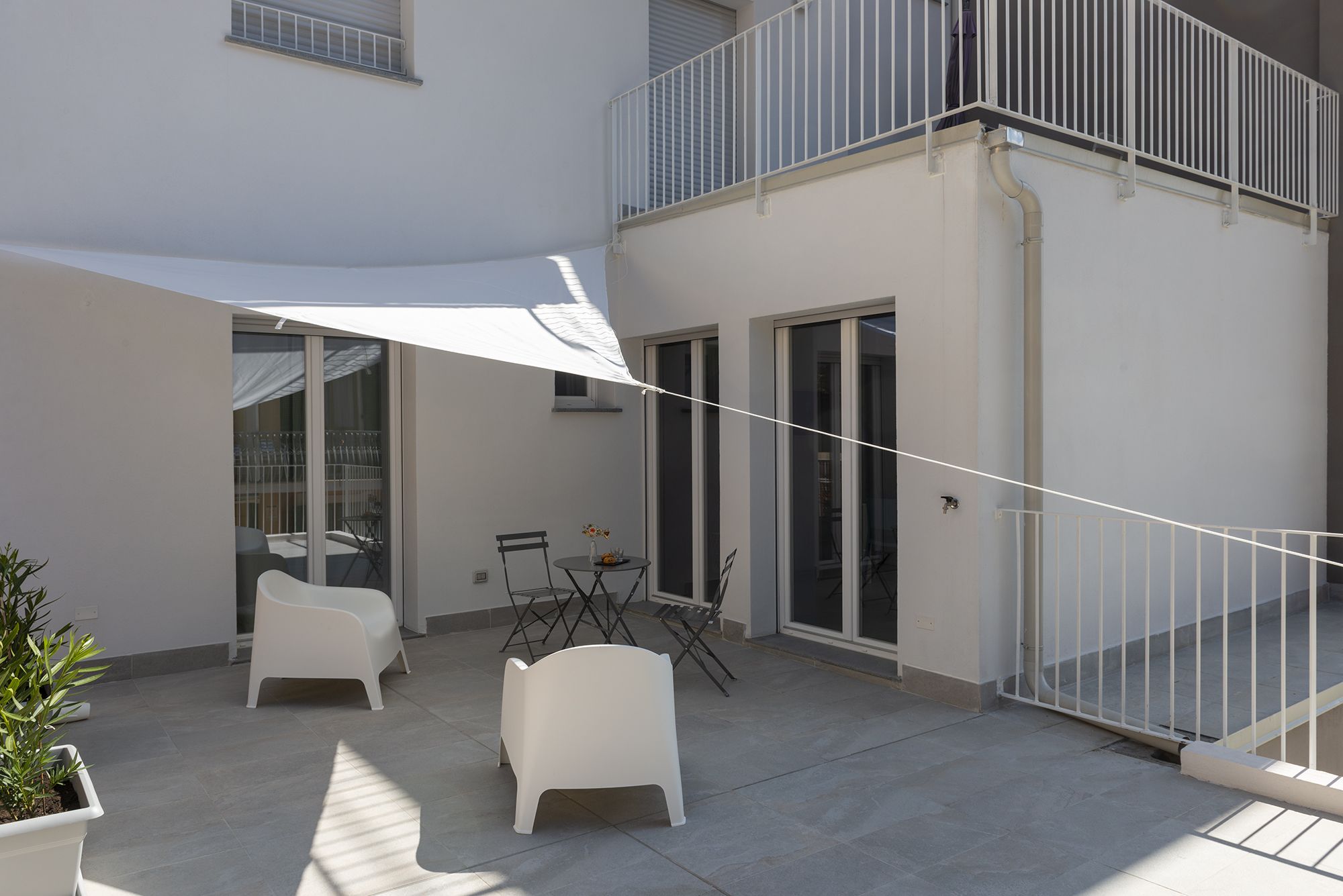 Dal soggiorno e da una camera da letto si può accedere a un grande terrazzo di 28 metri quadrati con vista giardino, attrezzato con tavolino, sedie e poltrone da esterno, tenda da sole.